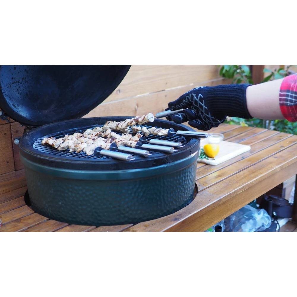 - Conveniently Designed: The stainless steel skewers are designed flat and wide to stop food from spinning or moving around when turning them on the grill. The attached push slider helps to easily push cooked food off for serving