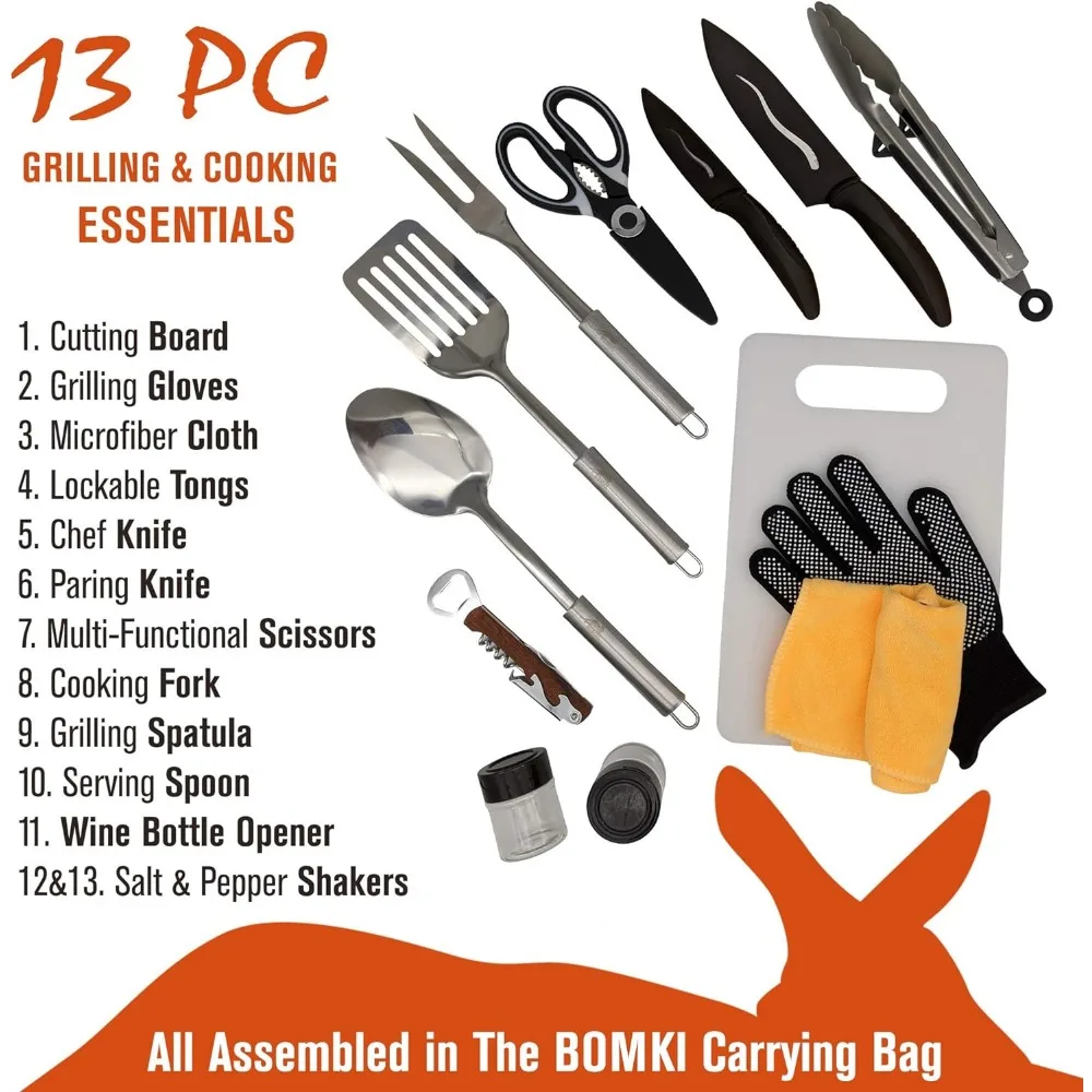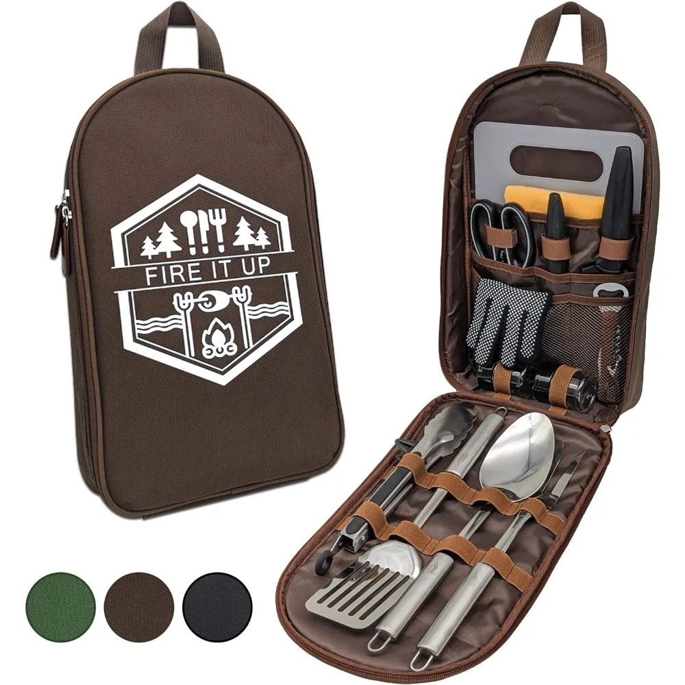 - MULTI-PURPOSE >> Complete grilling and camping utensil set for those fun days picnicking in the park, cooking outdoor, Barbeque, hiking, boat riding, RV camping, or car camping deep in the woods. This camp kitchen utensil set provides easy access to all your grilling accessories and cooking essentials while you are on the move.