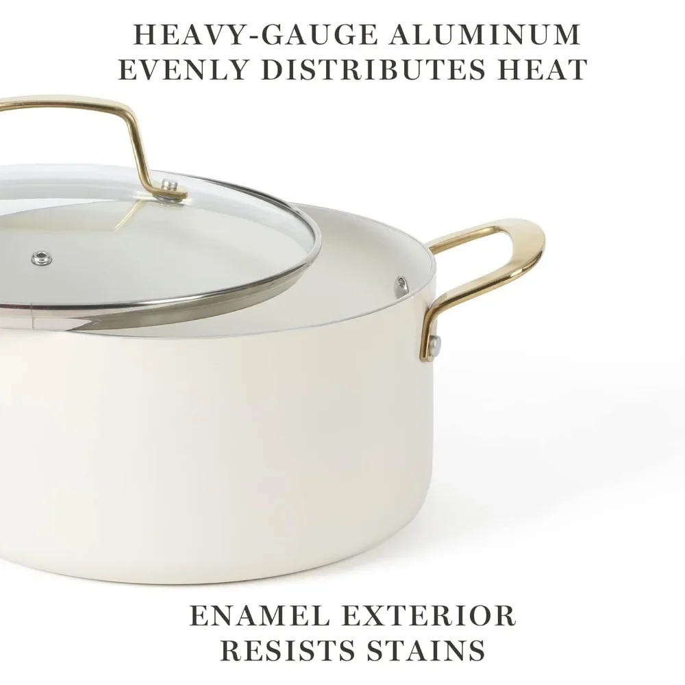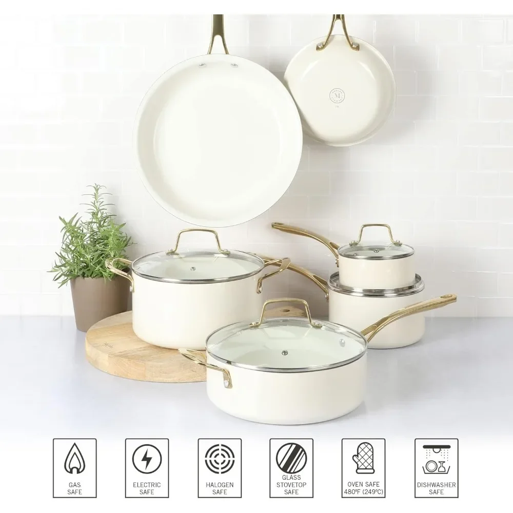 The Lockton 10-piece Aluminum Ceramic Nonstick Cookware Set from Martha Stewart is a contemporary suite of pots and pans accented with gold-colored stainless steel handles for a stylish cooking experience and presentation. Crafted from heavy-gauge aluminum, this impressive cookware heats and cooks evenly to whip up dishes with amazing flavors any time of the day. This collection beams with elegance inside out with a glossy enamel exterior to resist stains and a beauitful ceramic nonstick interior – made without PFOA and PTFE – to allow less oil and fat needed for easy food release and cleanup. Each pot and pan features riveted, gilded handles to offer a safe grip that is strong as it is luxurious. Vented, tempered glass lids complement each of the four pots perfectly as they seal in heat and moisture, bringing out the best, natural flavors while cooking. Built for style and function, this collection is safe to use on gas, electric, ceramic, and halogen stovetops. The pots and pans are oven safe up to 480°F, while the glass lids are safe up to 350°F. Dishwasher safe, hand wash recommended.