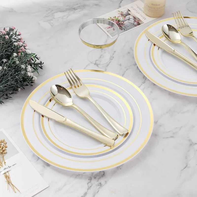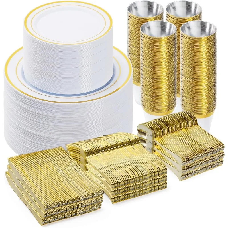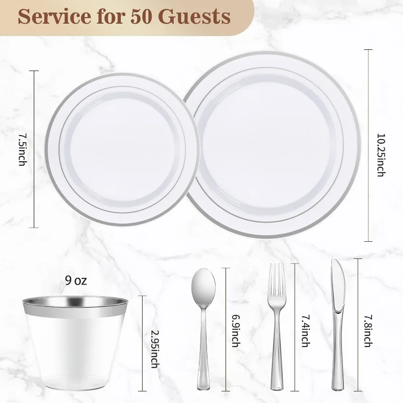 Plastic Dinnerware Set, Disposable Plates , Wedding, Anniversary, Includes: Dinner Plates, Dessert Plates, Cups, Spoons,